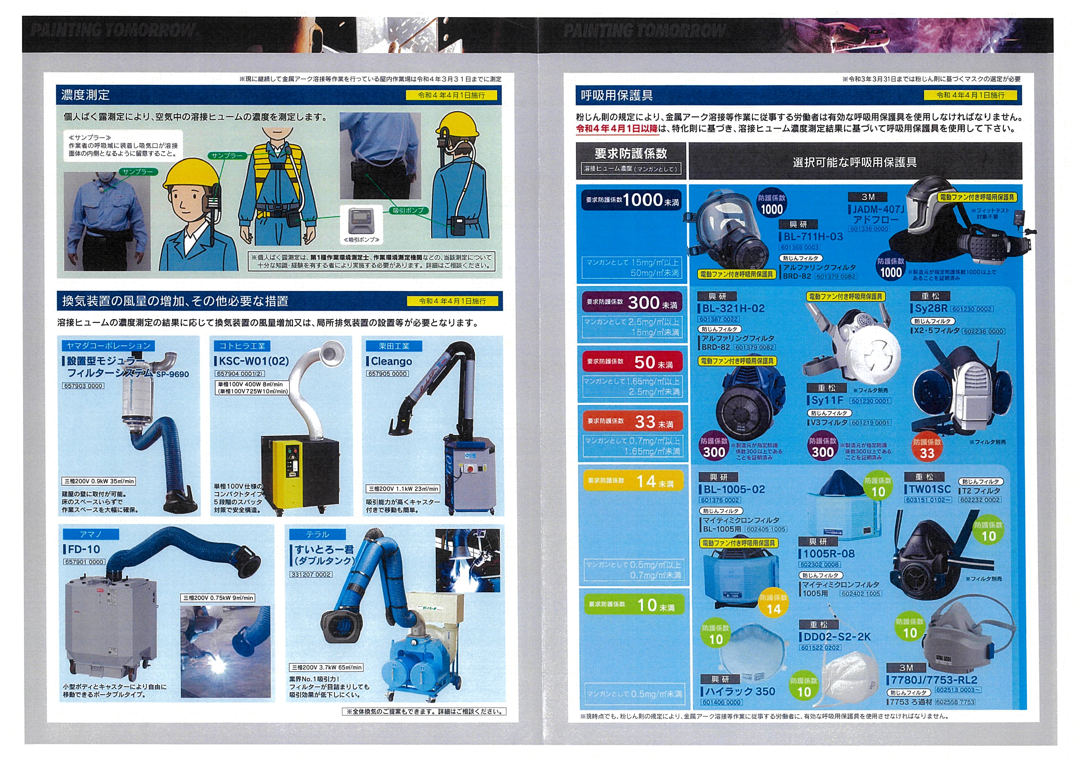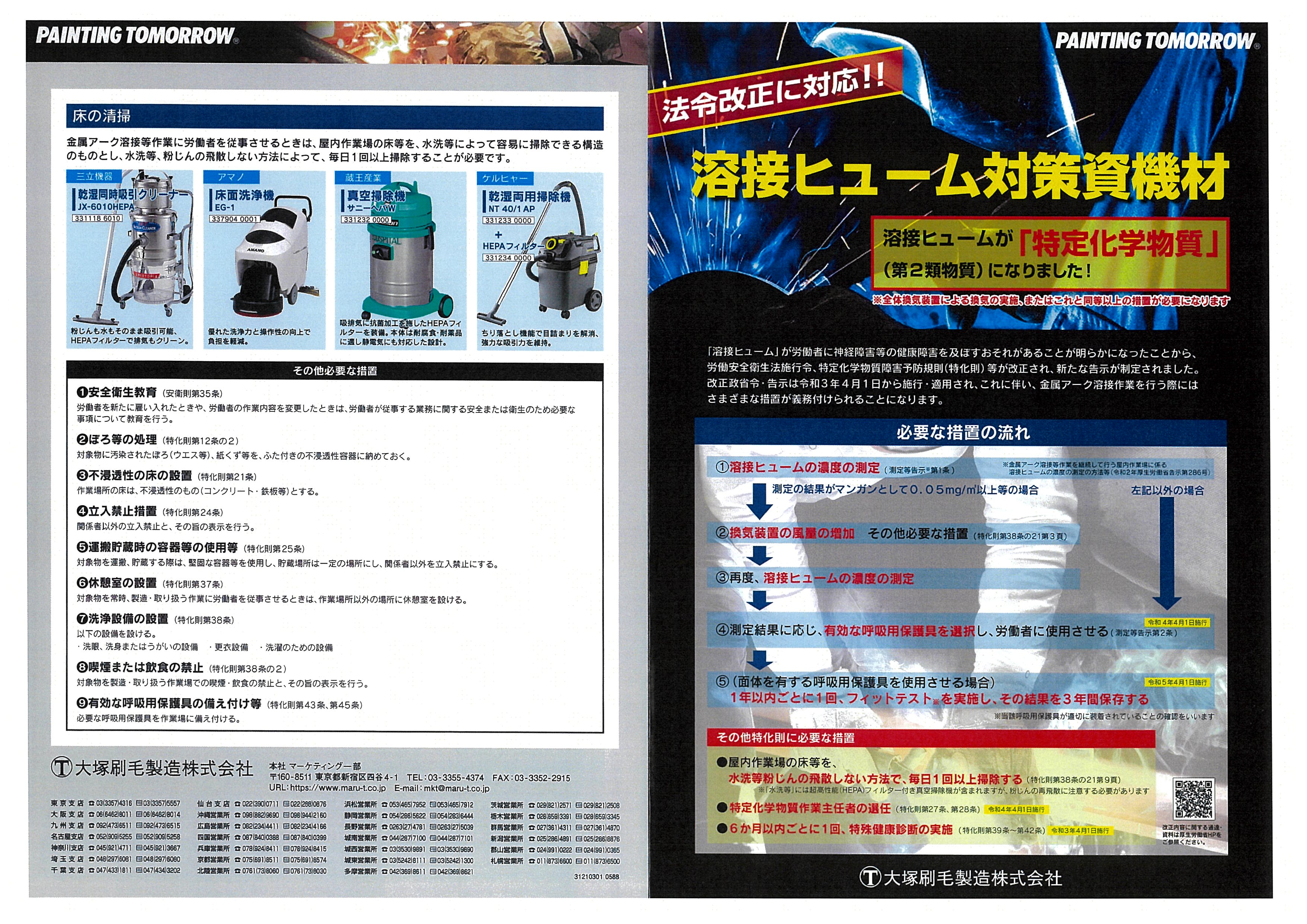 News お知らせ 製品情報 2021年4月8日(木) 溶接ヒューム対策資機材のご案内 令和3年4月1日より、溶接ヒュームが特定化学物質に追加となりました。 溶接ヒュームに係る労働者の健康障害防止対策を強化すること等を目的として、 「労働安全衛生法」や「特定化学物質障害予防規則」が改正されました。 これに伴い、金属アーク溶接作業等を行う際には、さまざまな措置が義務付けられることになります。 大塚刷毛製造㈱様では、保護具や換気装置のお取り扱いがございます。 詳細については、営業担当または最寄りの支店・営業所へお気軽にお問い合わせください。 次へ お知らせ一覧へ 前へ