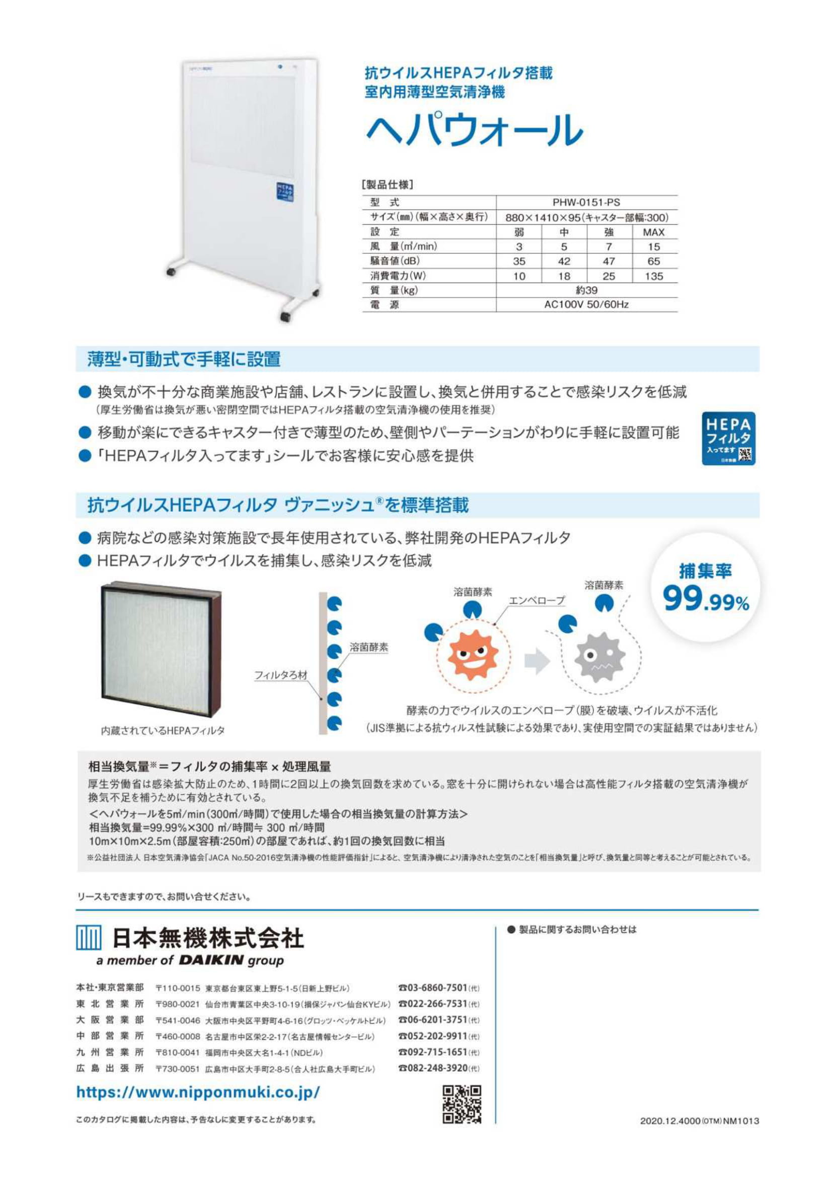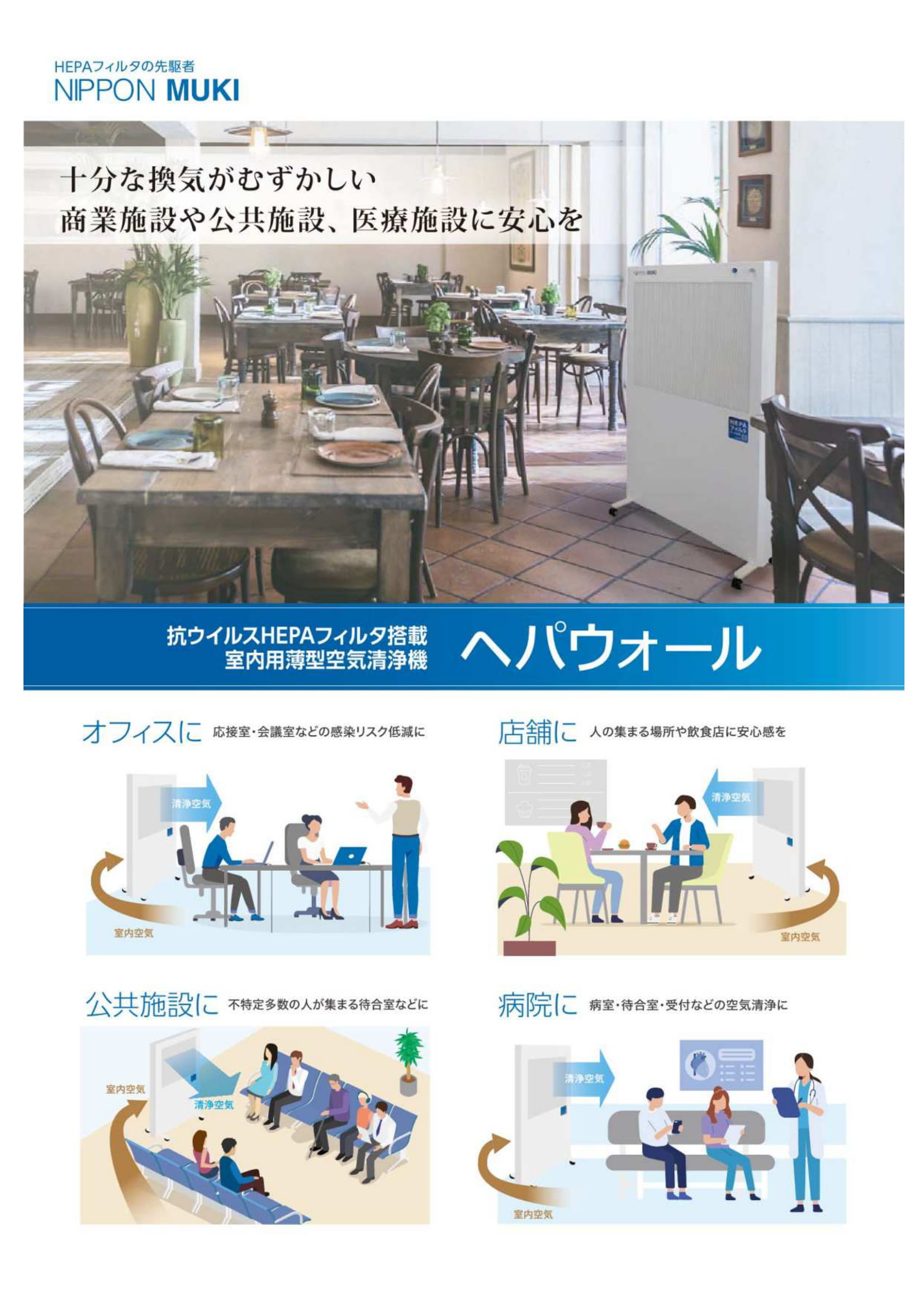 今回は、日本無機株式会社様の「抗ウイルスHEPAフィルタ搭載 室内用薄型空気清浄機 へパウォール」をご紹介いたします。