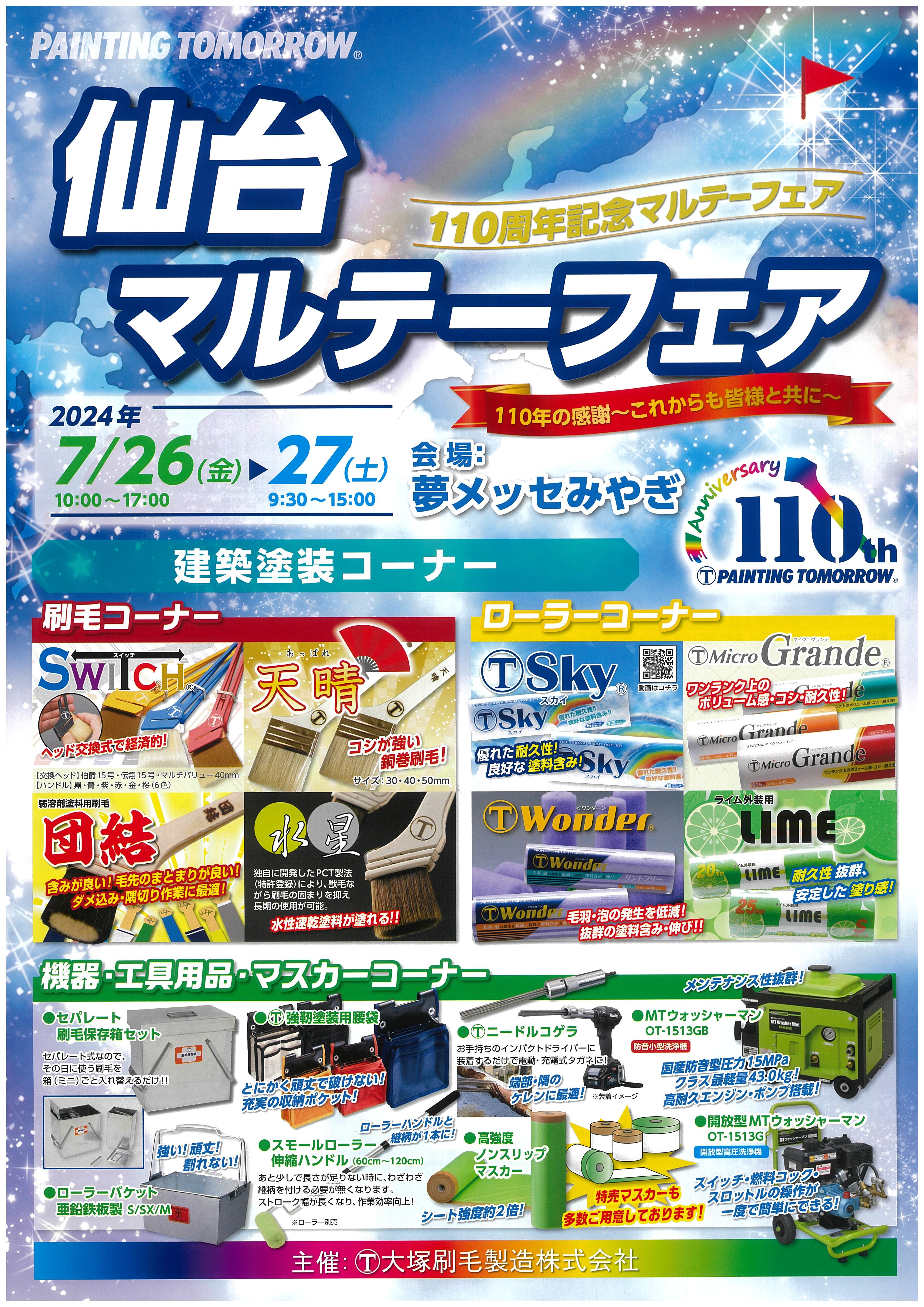 今年で110周年を迎えた大塚刷毛製造(株)様が皆様へ感謝の気持ちを込め「110周年記念仙台マルテーフェア」を開催致します。