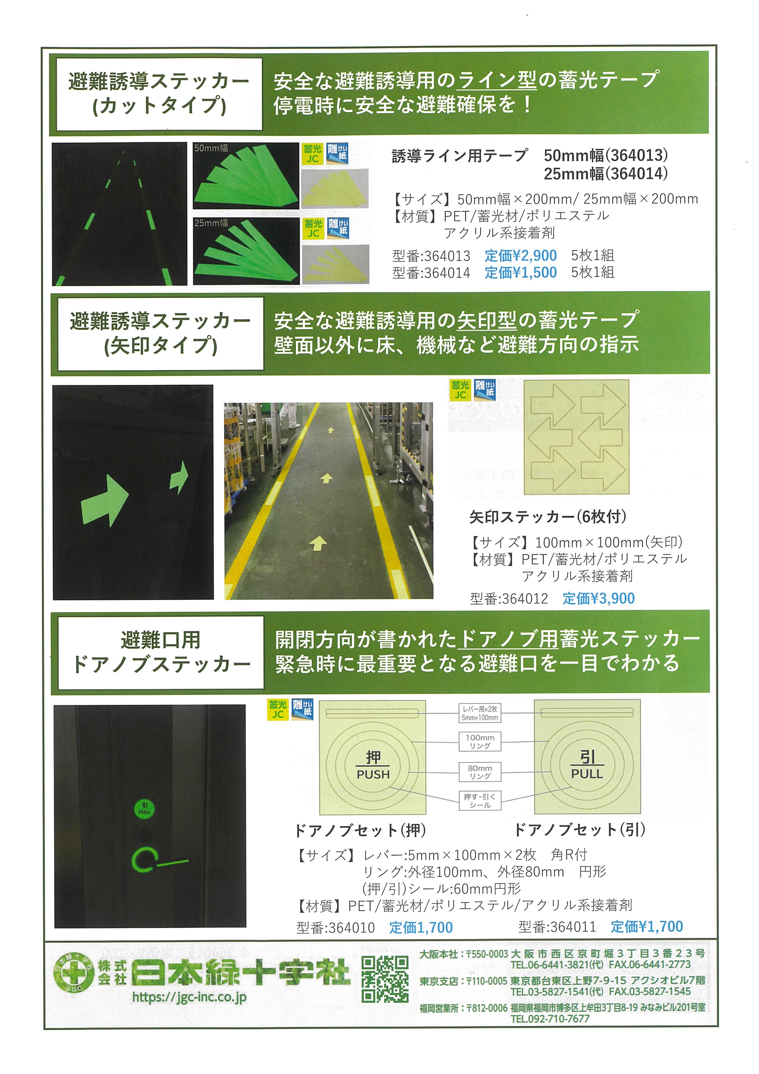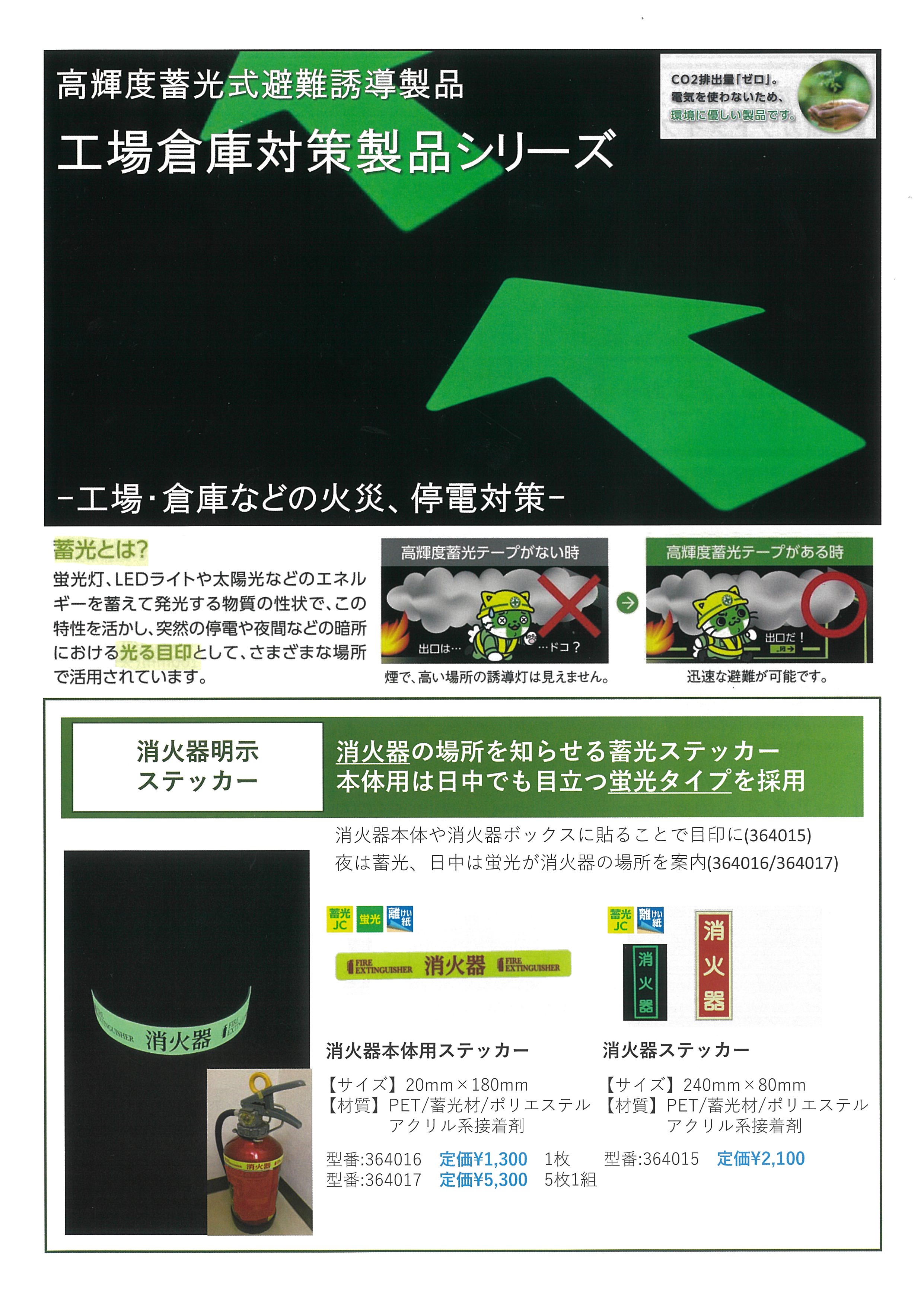 こちらの商品は、夜は蓄光、日中は蛍光に光ることで、いつ災害が起きても消火器を見つけることが出来ます。