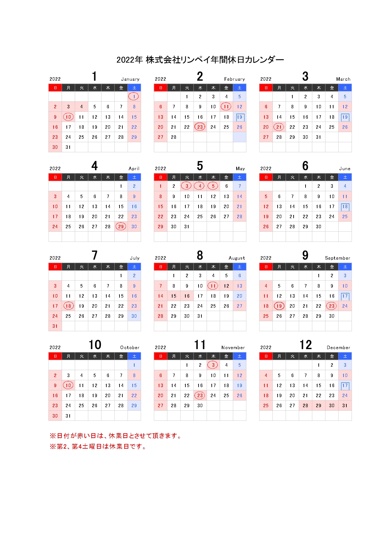 News お知らせ 重要なお知らせ 2021年12月13日(月) 令和4年 年間カレンダーのご案内 ますます寒さが厳しくなって参りましたが、皆様いかがお過ごしでしょうか。 2022年の弊社年間休日は下記の年間カレンダーの通りとなります。 2022年も連休等多々ございますので、ご注文やお問合せ等ある場合はお早めにご連絡下さい。 今年も残り僅かとなりましたが、今後ともお引き立てくださいますようお願い申し上げます。 次へ お知らせ一覧へ 前へ