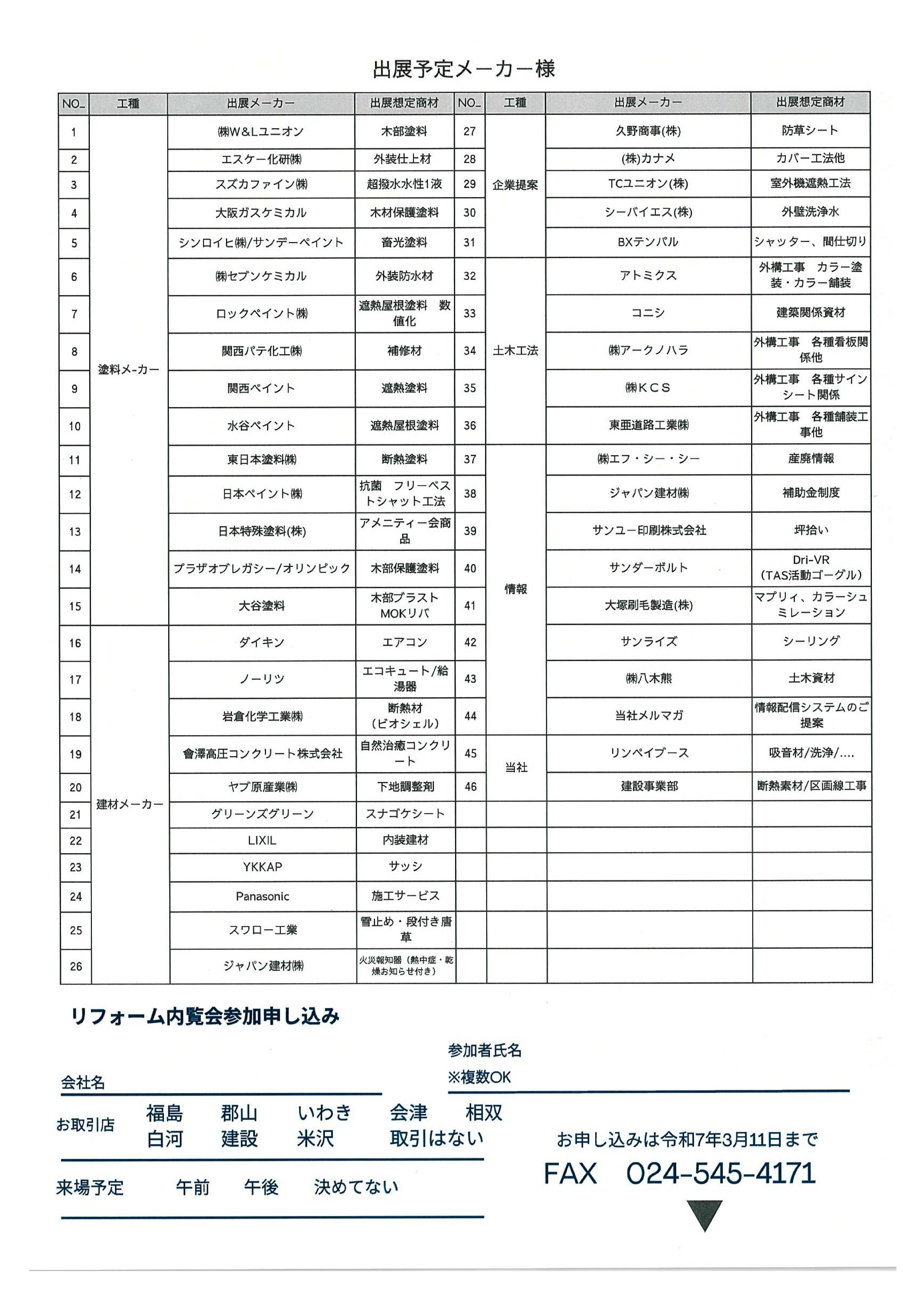 | 概要 | リフォーム内覧会を開催いたします。50社以上の製造メーカー様にご出展いただき、塗装工法や新工法、建材・住設、販促製品など、数多くの商品やサービスをご案内いたします。建設の今が全てわかるイベントとなっており、入場も無料となっておりますので、皆様是非ご来場ください! |