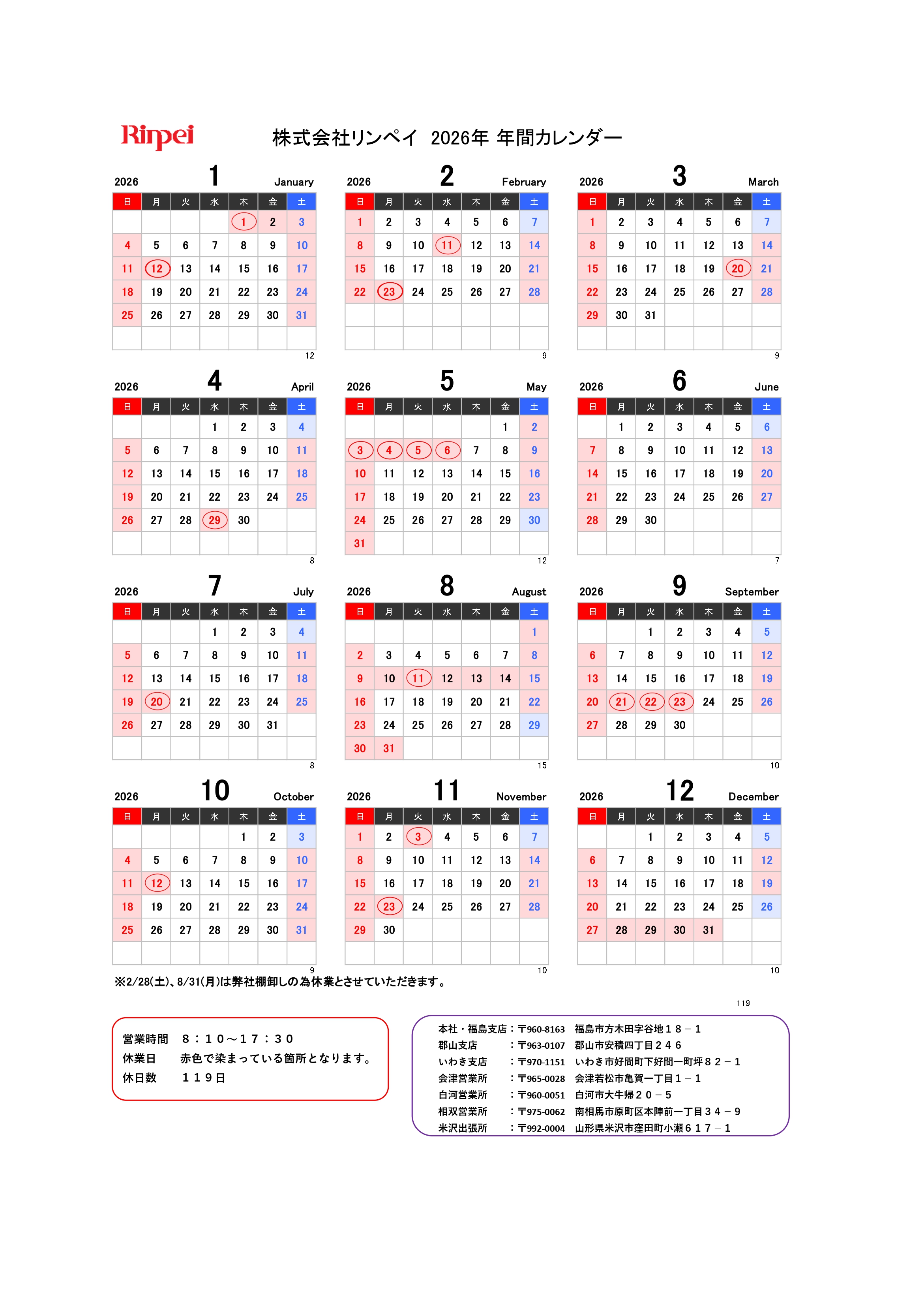 News お知らせ 重要なお知らせ 2025年12月6日(土) 令和8年 年間カレンダーのご案内 師走の寒気が身にしみる季節となりましたが、皆様いかがお過ごしでしょうか。 2026年の弊社年間休日は下記の年間カレンダーの通りとなります。 2026年も連休等多々ございますので、ご注文やお問合せ等ある場合はお早めにご連絡下さい。 今年の残り僅かとなりましたが、今後ともお引き立てくださいますようお願い申し上げます。 お知らせ一覧へ 前へ