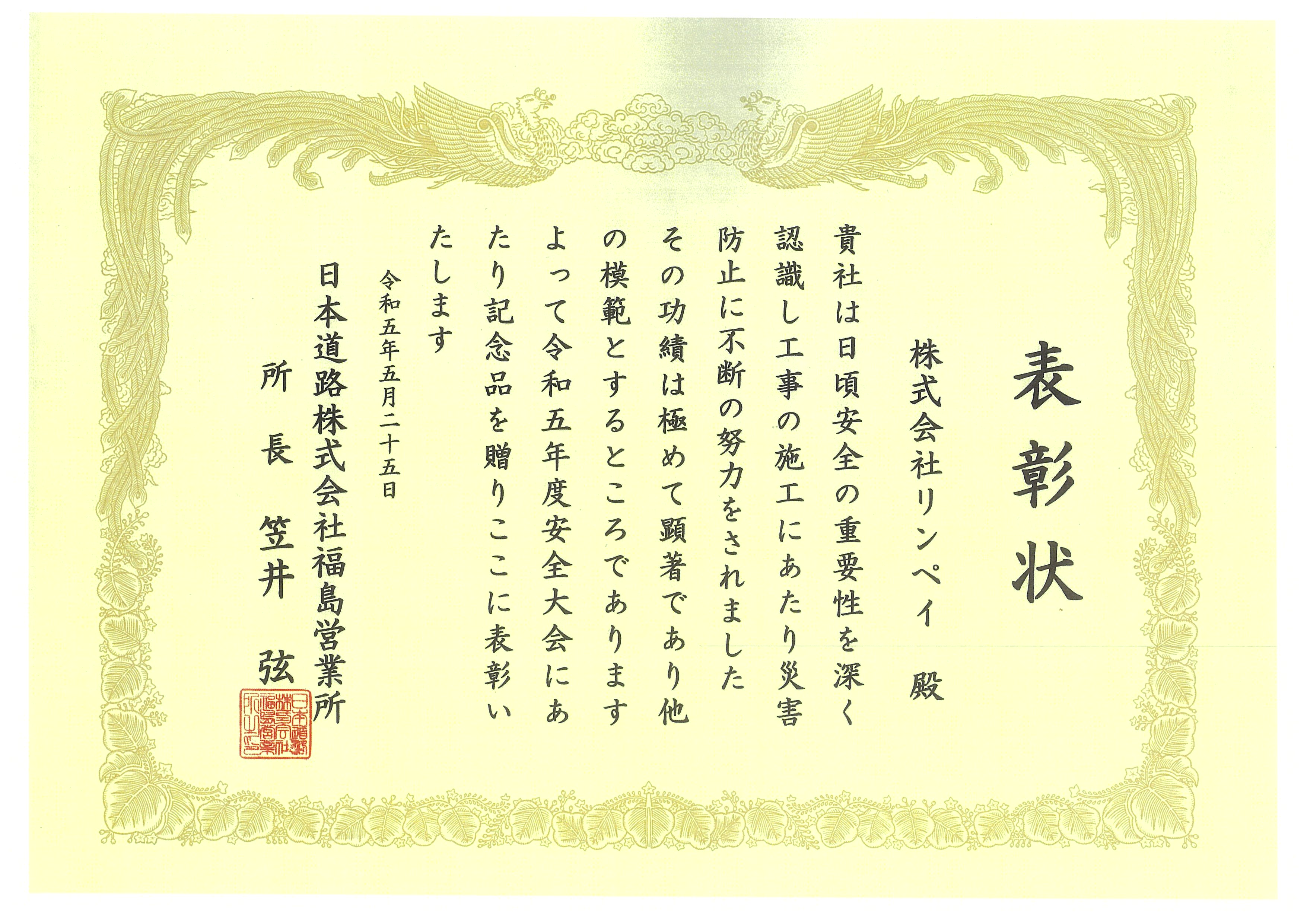 日本道路株式会社福島営業所様の安全大会にて表彰を頂きました。
